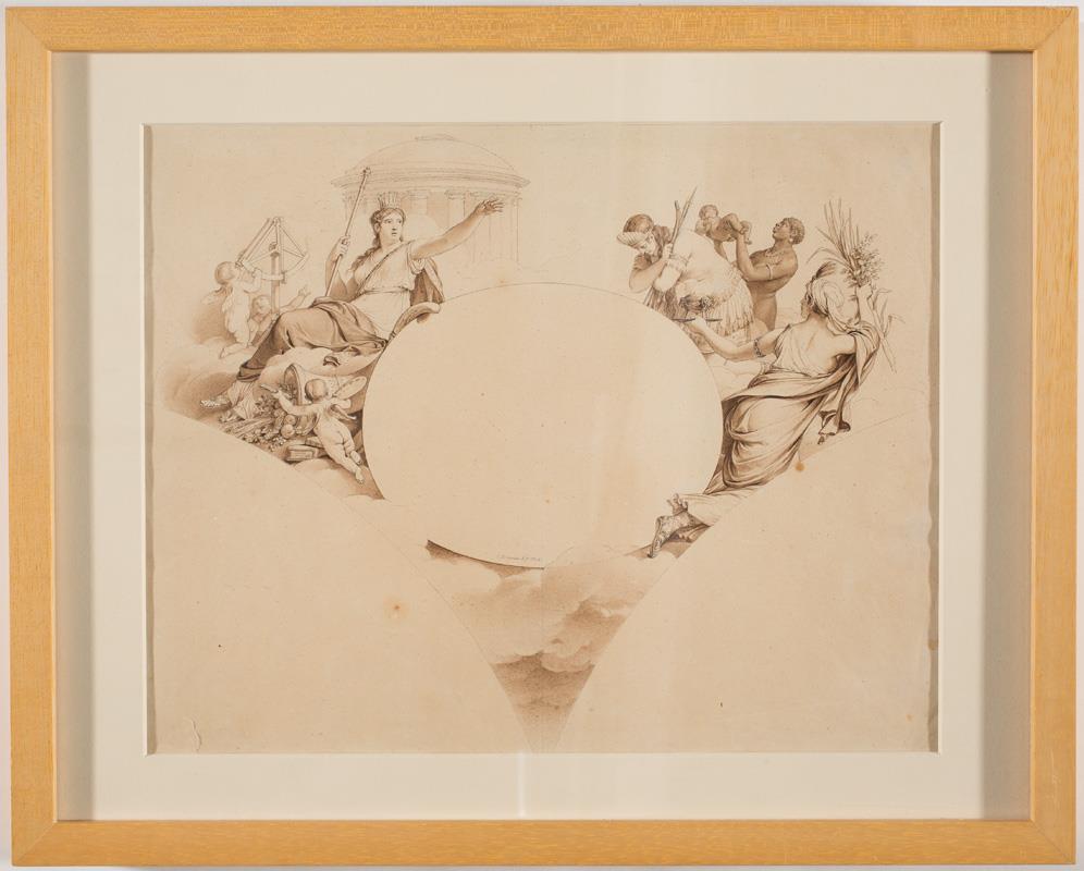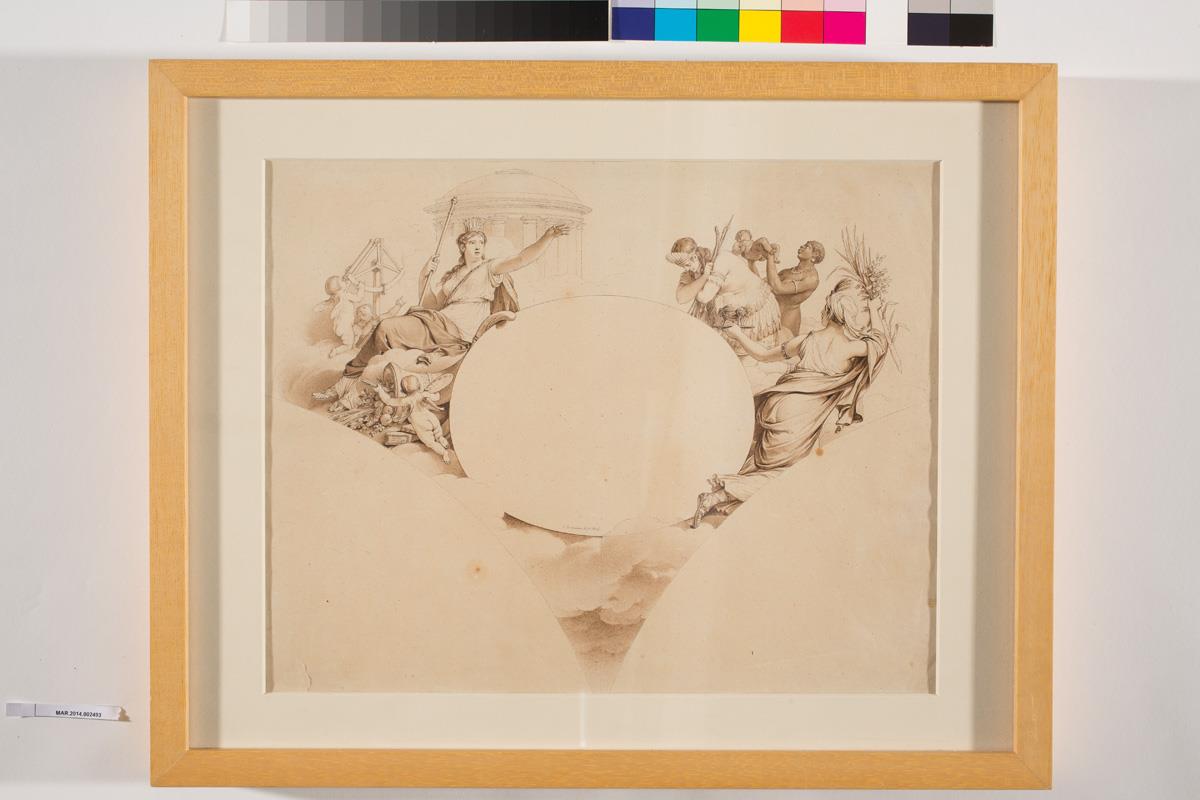 Desenho / Alegoria. Obra com representação alegórica da América. Nos dois cantos inferiores tem um desenho circular, com raio partindo de cada canto até o centro inferior e traçado para as laterais externas correspondentes, formando um quarto de circulo em cada ponta; o centro, tem desenhado nuvens que se distribuem para as laterais formando o plano da ilustração, bem ao centro da obra tem desenhado uma elipse vazia que ocupa o terço central do desenho, tanto na linha horizontal como na vertical, e o desenho figurativo se concentra na metade superior da obra. Do lado esquerdo tem desenhado uma musa com coroa e segurando um cetro com a mão direita, ela é representada trajando túnica grega, capa e sandálias, e está com a mão esquerda estendida; aos pés dela um anjo com cesto de frutas e ao seu lado direito (esquerdo da obra) dois anjos manuseando um sextante (instrumento náutico); atrás da musa tem desenhado um templo com abóbada. Do lado direito da obra, em oposição, tem representações de três figuras femininas, uma indígena com cocar, adorno e vestimenta plumária, segurando arco e flecha junto ao corpo, em posição de reverência; uma negra, nua e com adornos corporais, erguendo bebê; e uma branca, com vestimenta grega, segurando uma bandeja com uma mão e um ramo de flores com a outra.