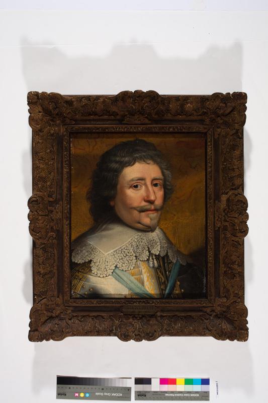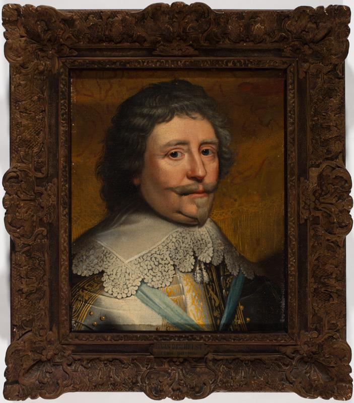 Pintura / Retrato de figura masculina. Trata-se do retrato de uma figura masculina representado parcialmente de perfil. Sua fisionomia é séria. Ele usa bigode e veste uma roupa que tem uma gola com uma espécie de renda na barra. Abaixo do retrato vê-se uma placa, presa na moldura, na qual lê-se "B. VAN DER HELST EC. HOL. 1611-1670".