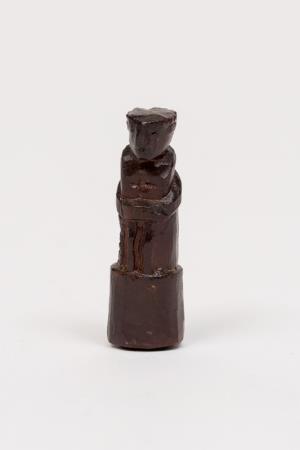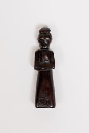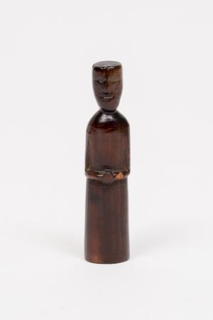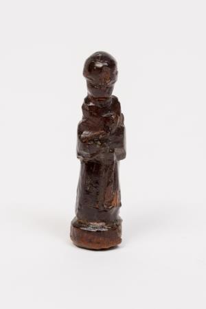 Escultura / Figura humana. A obra é uma escultura em madeira representando uma figura humana, de pé, em posição frontal, cabeça reta. Braços flexionados à frente, o que seriam as mãos, estão juntas sobre o abdômen. Traja túnica lisa, sem base.