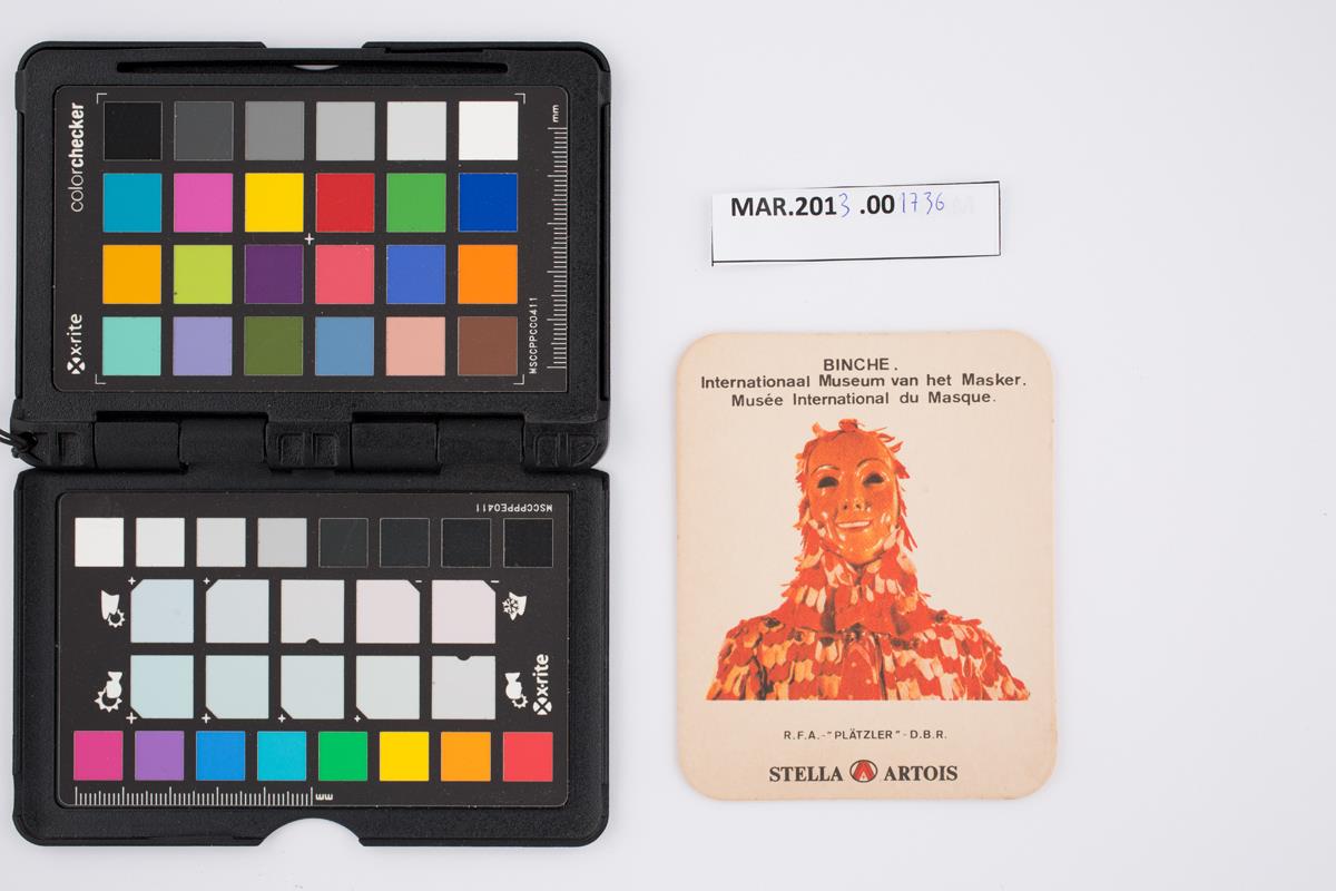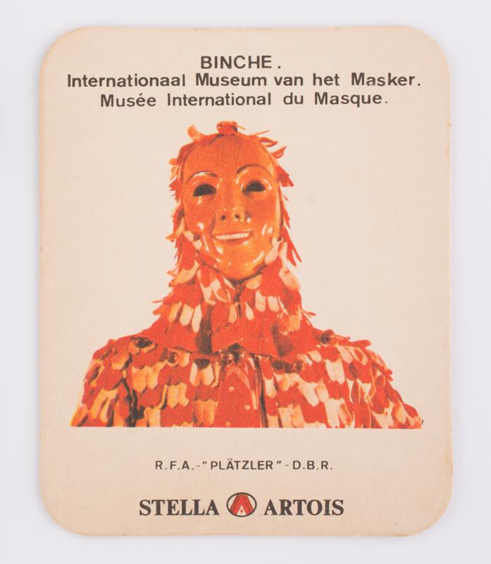 Objeto / Porta-copo. Em papel cartão com impressão em cores. Em cima ao centro lê-se 'BINCHE. Internationaal Museum van het Masker. Musée International du Masque.'. Ao centro há a impressão em cores do busto de uma fantasia vestível com máscara nas colorações amarela, laranja e vermelho. Embaixo ao centrolê-se 'R.F.A. - "PLÄTZLER" - D.B.R. STELLA ARTOIS'.